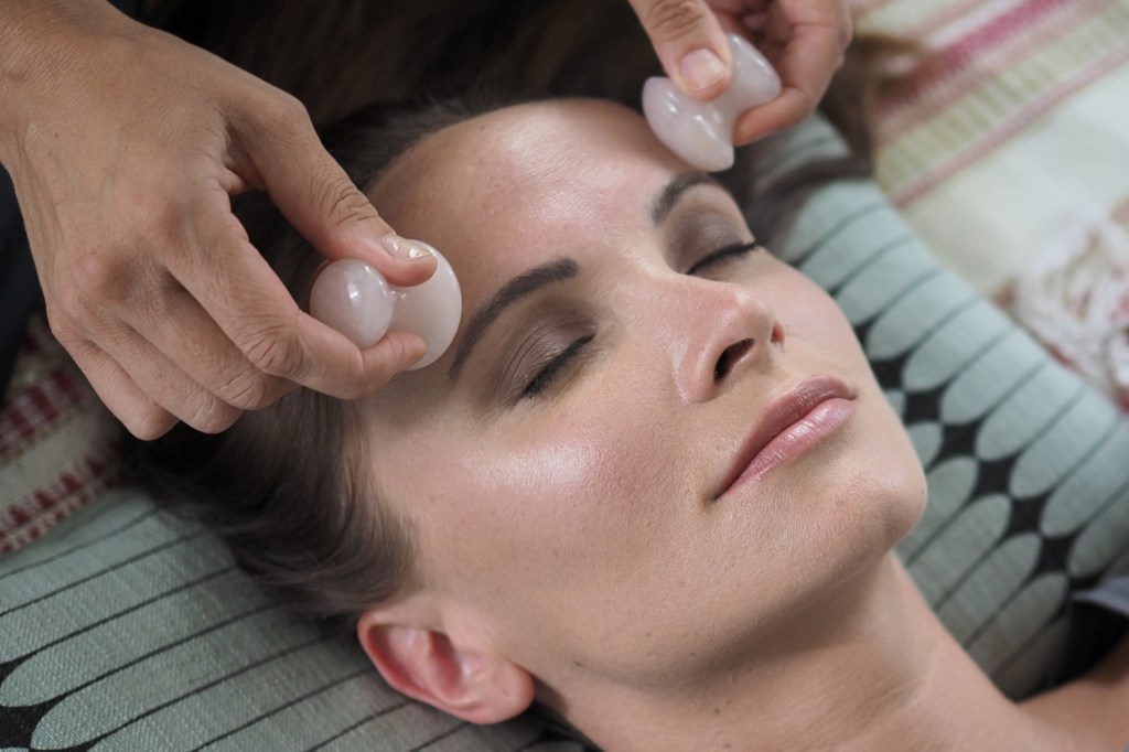 Massage du contour des yeux et du visage effectué avec des cristaux de roche.